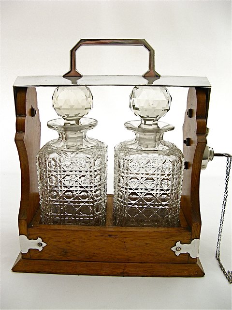 1800-tals engelsk tantalus 2 slebne karafler i en egetræs kasse med forsølvede beslag længde 25 cm. højde 30 cm.