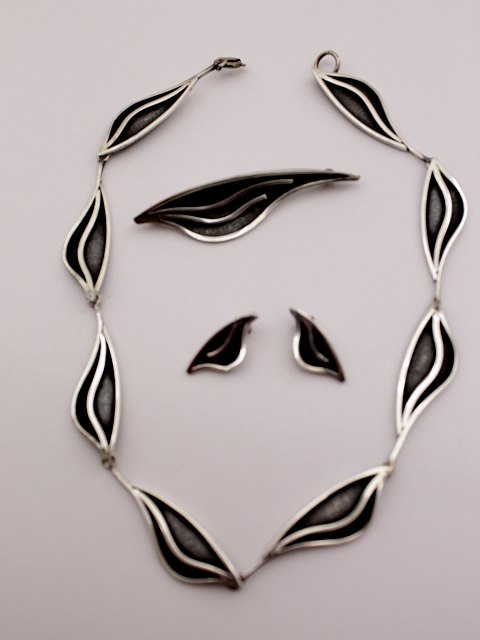 Sølvsmed Rudolf Andresen Aabenraa smykkesæt sterling sølv bestående af halskæde 39 cm. broche 6,8 cm. øreclips 2,5 cm. Nr. 284673