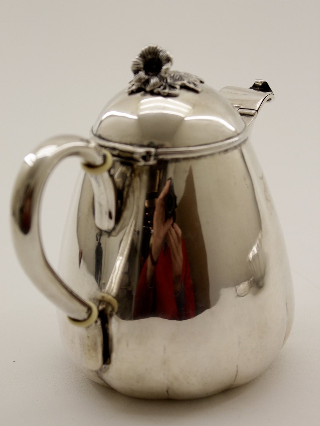Sølv kande H. 14 cm. med våbenskjold stemplet NCC for sølvsmed Niels Christensen Clausen Odense 19.årh. proveniens hidhørende fra fynsk herregård. Nr. 317564