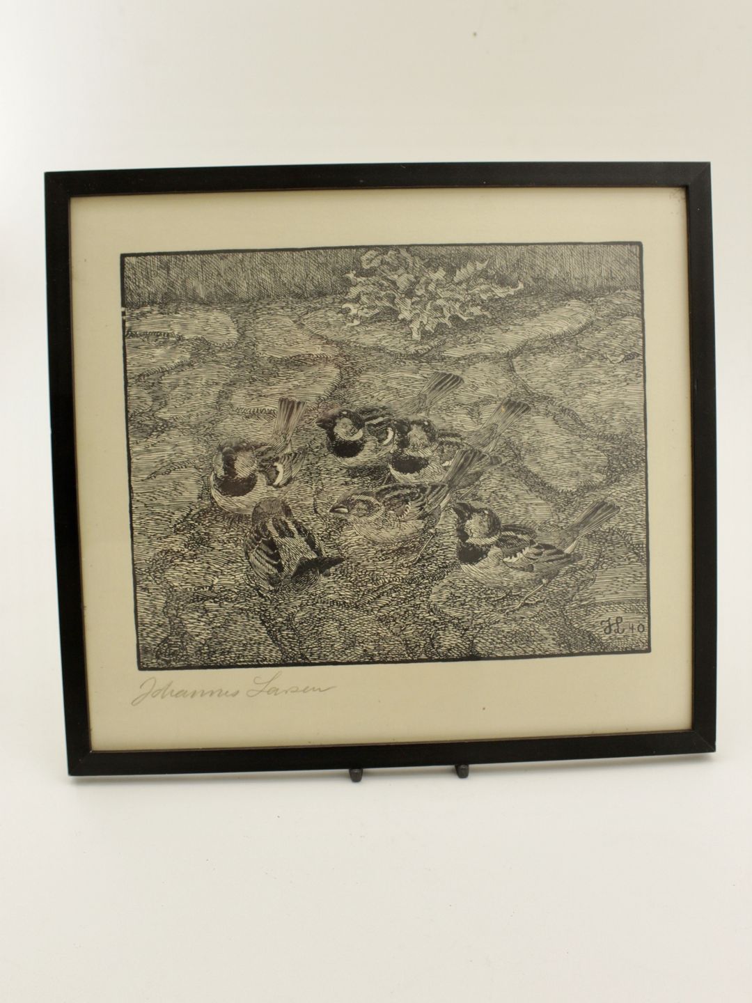 Johannes Larsen træsnit 30 x 33 cm. gråspurve signeret Johannes Larsen Nr. 372803