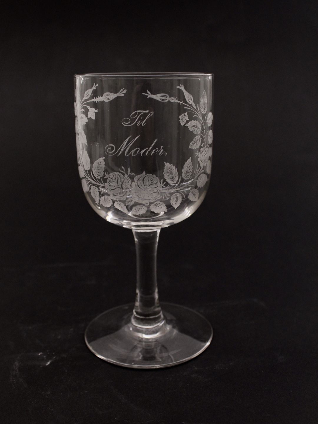 Glas 15,5 cm. med devise "Til Moder" Kastrup glas 1910